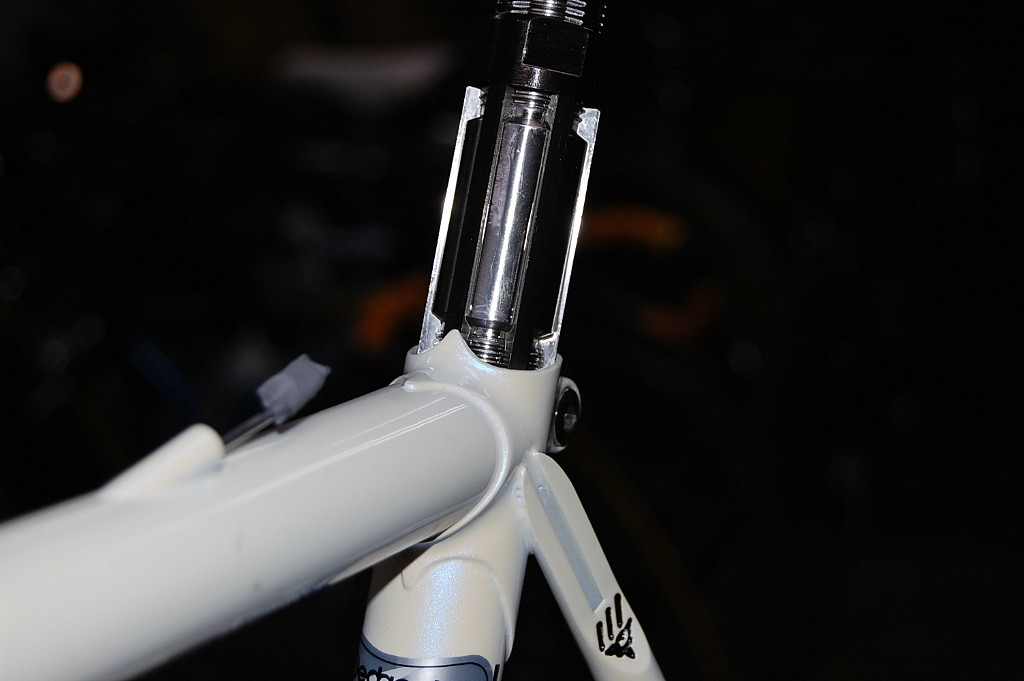 同じ理由で、溶接時の熱歪みで変形しているであろうシートチューブの内部の仕上げです。真円に仕上げるとともに、今回は金メッキしたシートポストを使用しますので、メッキとその後のクリアー塗装で多少太くなっている部分の修正も兼ねています。