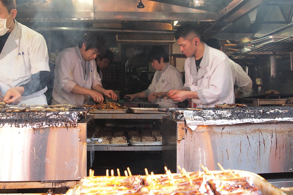 焼き場の横に積み上げられたみかん箱の中は、おそらく串打ちして白焼きした鰻が沢山詰まっているのでしょう。