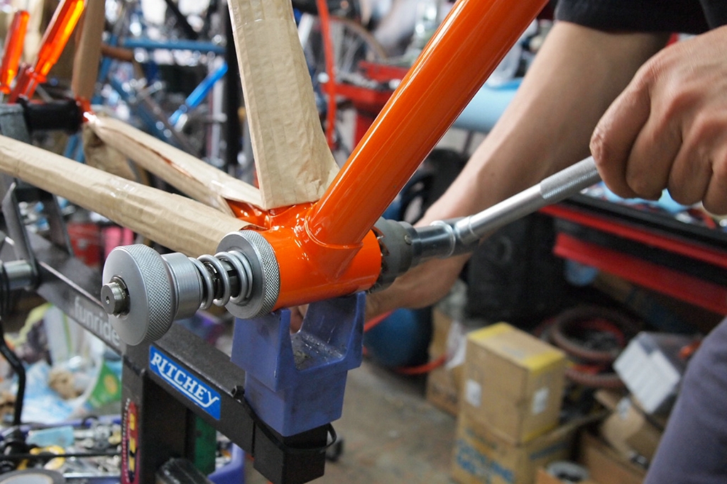 シートチューブをリーマーがけして、ハンガータップ立て、フェーシングしてその後防錆ワックスを内部に塗布。